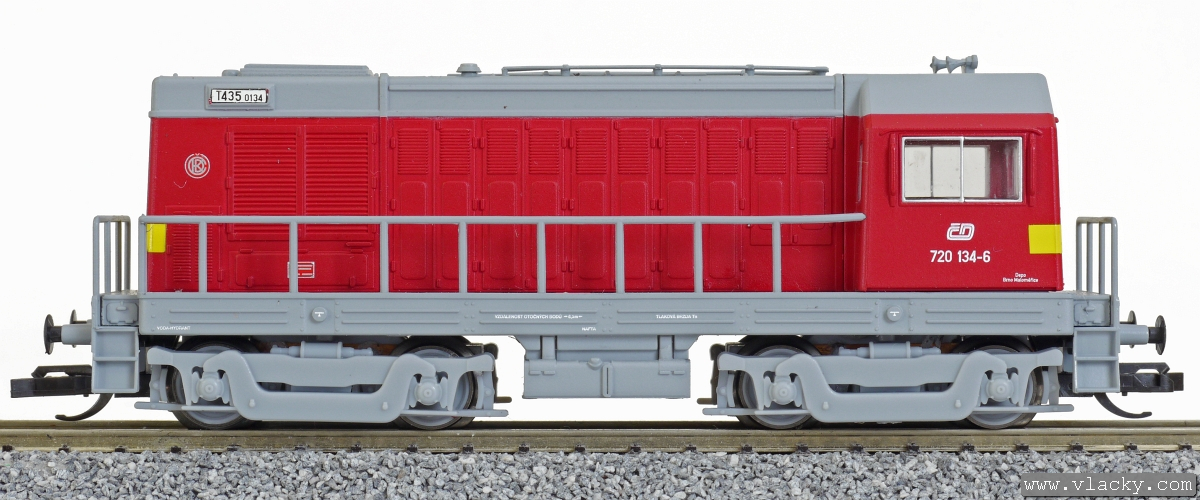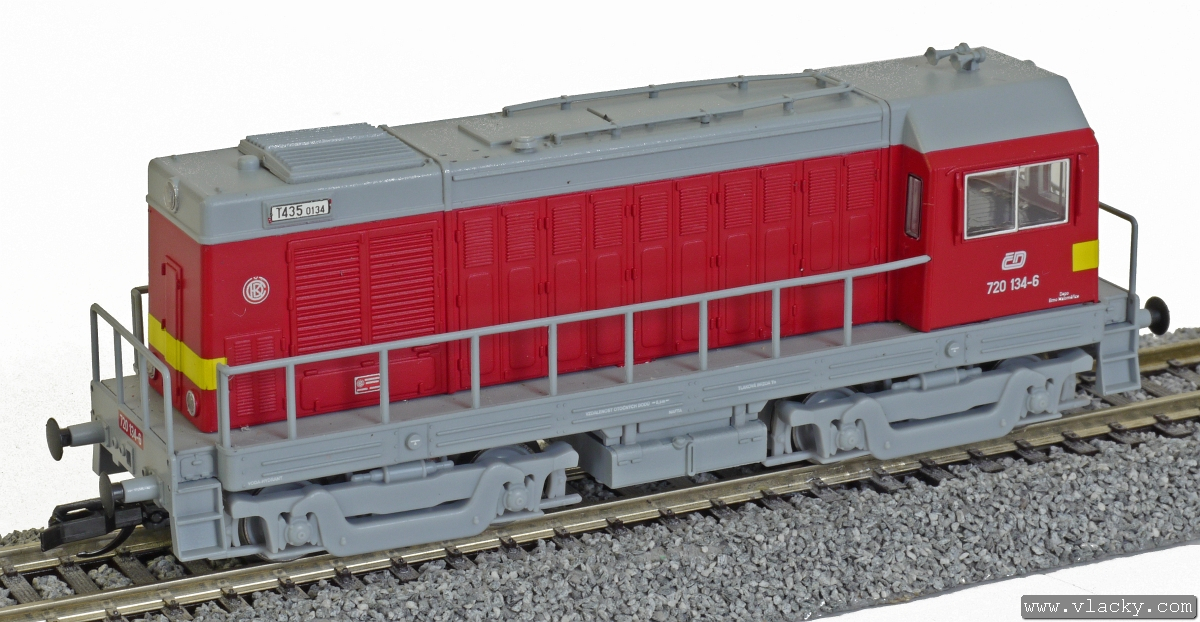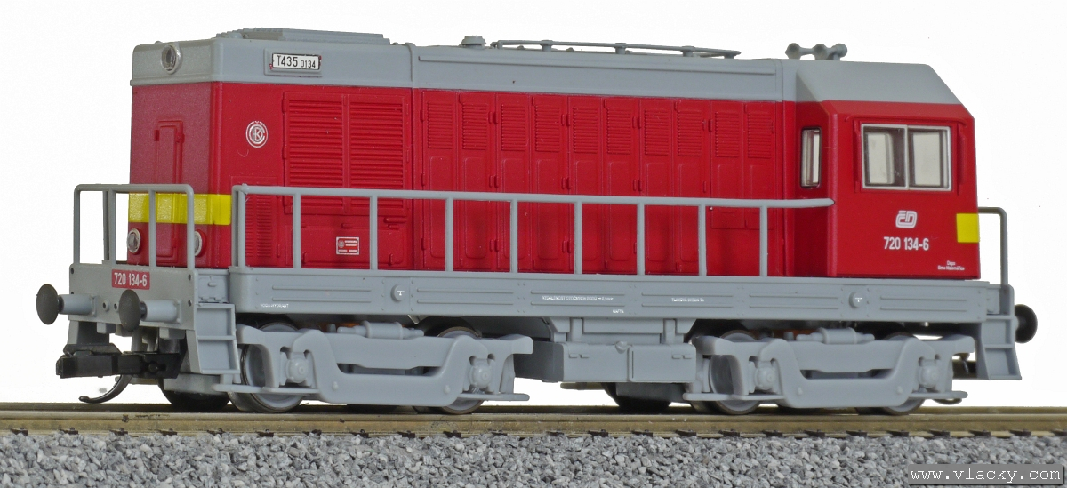 | dieselová lokomotiva červená s výstražným žlutým pásem, šedá střecha, rám a pojezd |