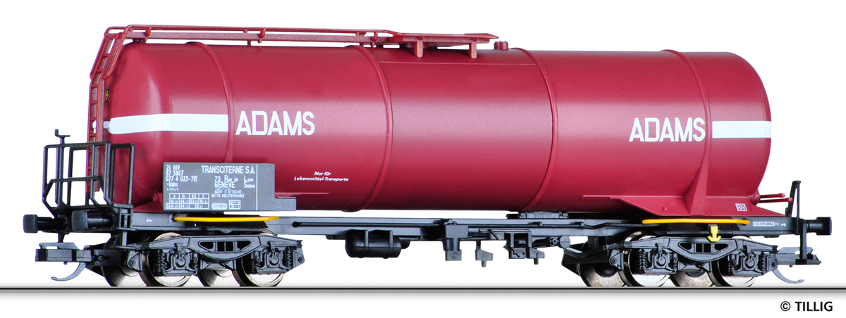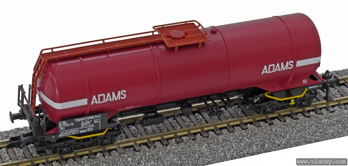| tmavě červená s bílými pásy a logem „ADAMS Transciterne S.A.“ |