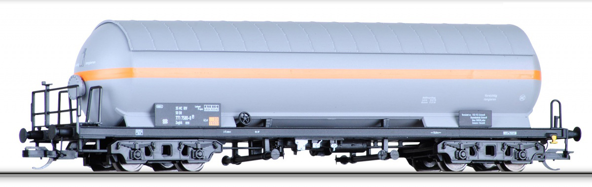 | cisternový vůz šedý s oranžovým pruhem a se slunečním štítem |