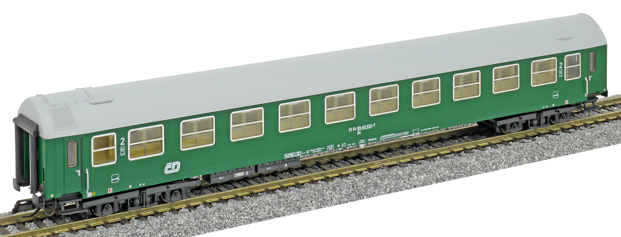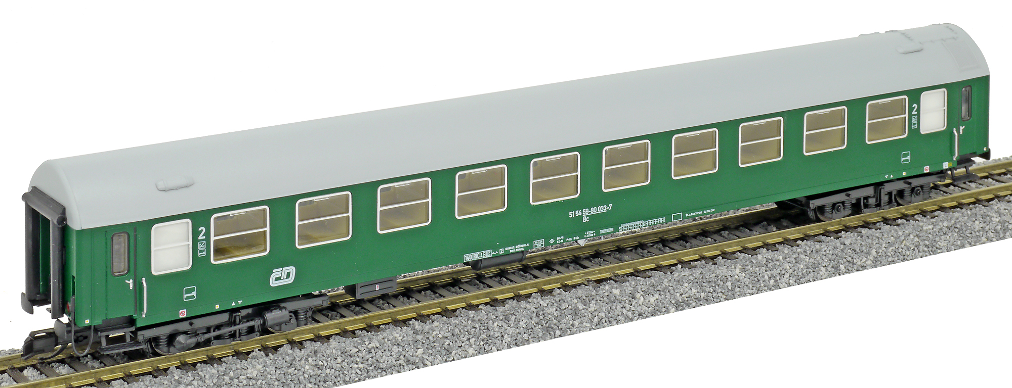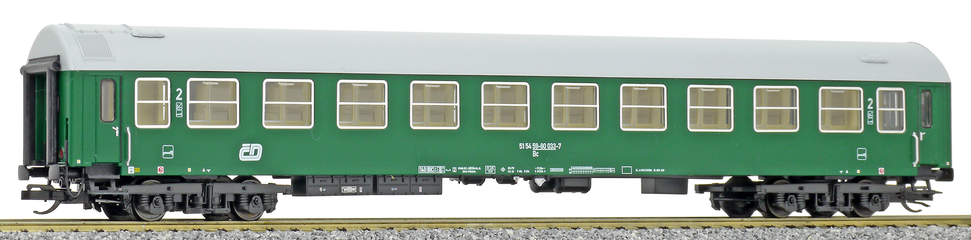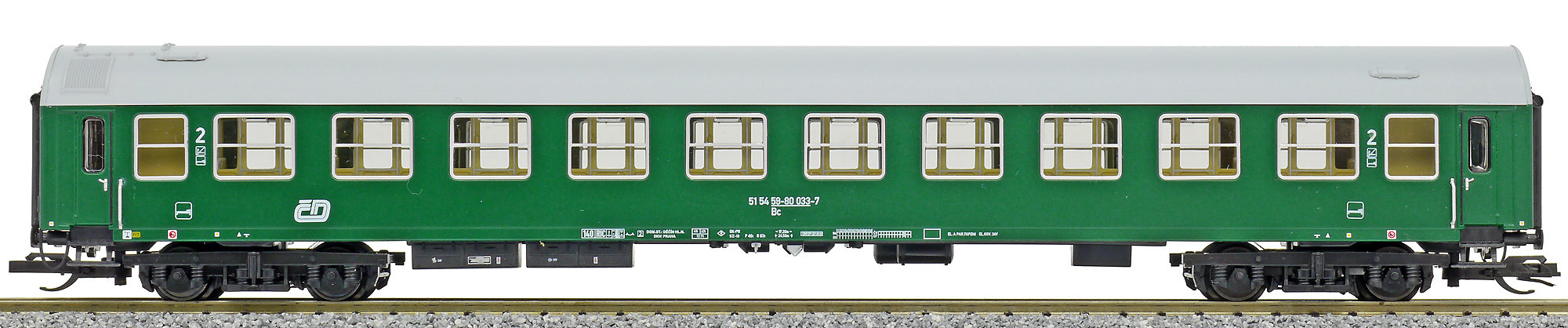 | • 51 54 59-80 033-7 | → | osobní vůz s pevným rozchodem bez klimatizace mezinárodní provoz RIC |