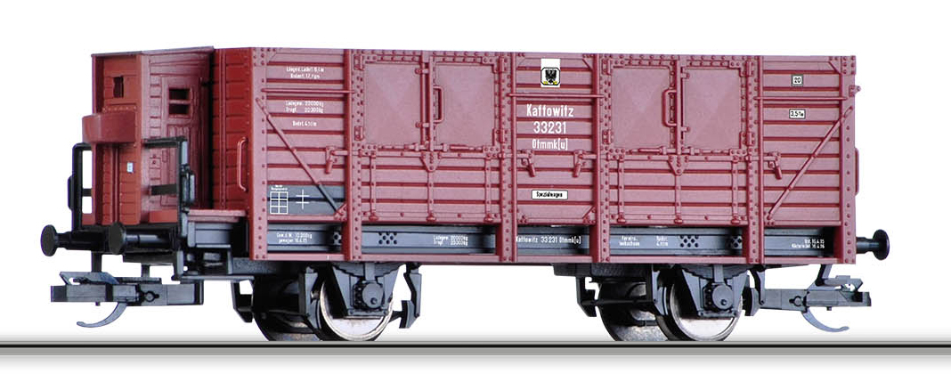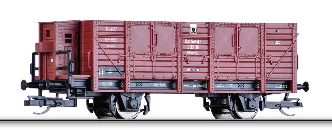 | vysokostěnný vůz s brzdařskou budkou a s nákladem uhlí |