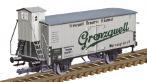 | chladící vůz bílý s šedou střechou a s brzdařskou budkou „Grenzquell Brauerei“ |