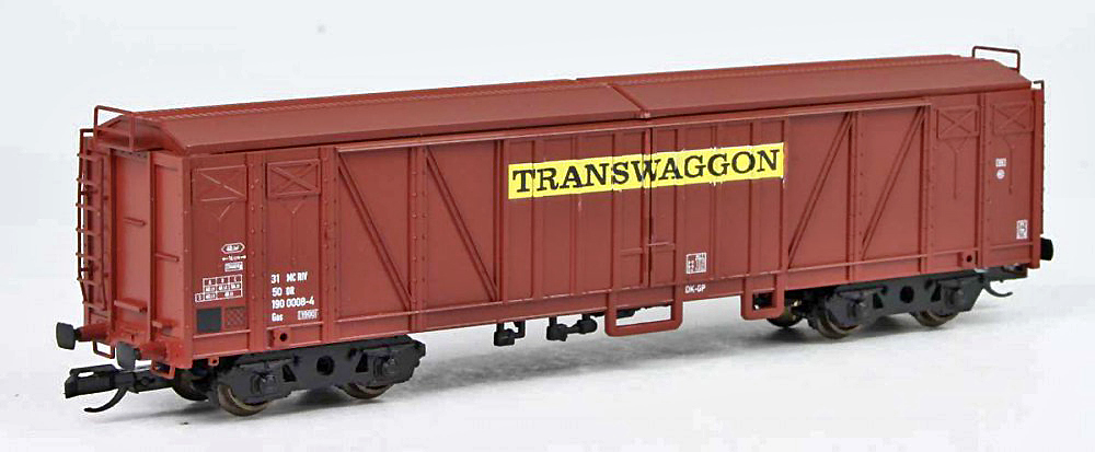 | krytý vůz červenohnědý s červenohnědou střechou „TRANSWAGGON“ |