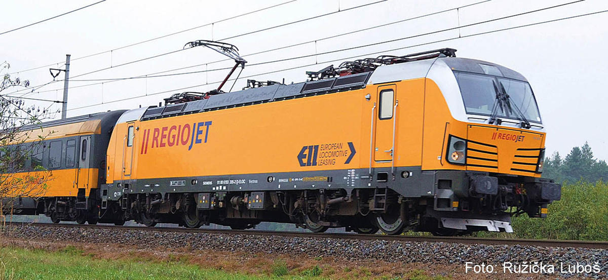 | elektrická lokomotiva „Vectron“ v oranžových barvách RegioJet |