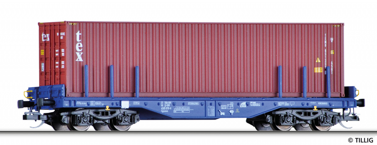 | plošinový vůz modrý s nákladem 40' kontejneru |