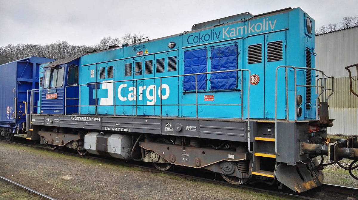 | dieselová lokomotiva světle modrá s šedým rámem a pojezdem |