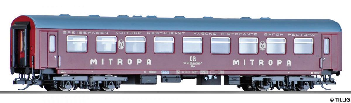 | jídelní vůz vínově červený s šedou střechou „MITROPA“ |