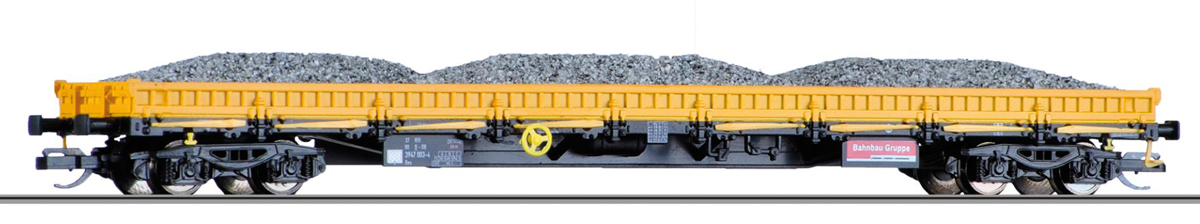 | nízkostěnný nákladní vůz žlutý do pracovního vlaku s nákladem štěrku |