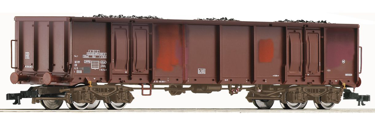 | vysokostěnný nákladní vůz červenohnědý patinovaný s nákladem uhlí |