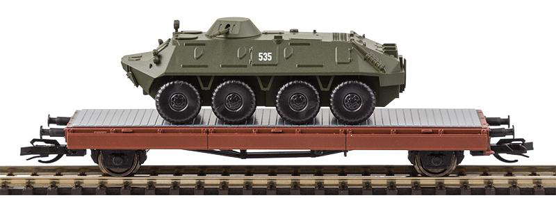 | plošinový vůz hnědý s nákladem bojového vozidla SPW60PB |