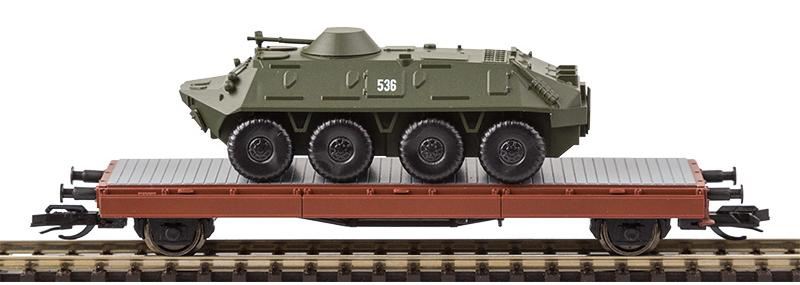 | plošinový vůz hnědý s nákladem bojového vozidla SPW60PB |