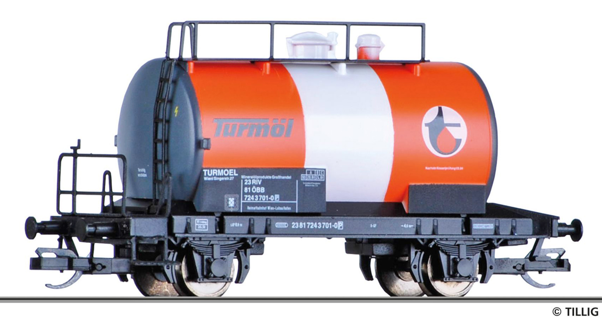 | kotlový vůz tmavě šedý s pásy oranžová-bílá „Turmöl“ |