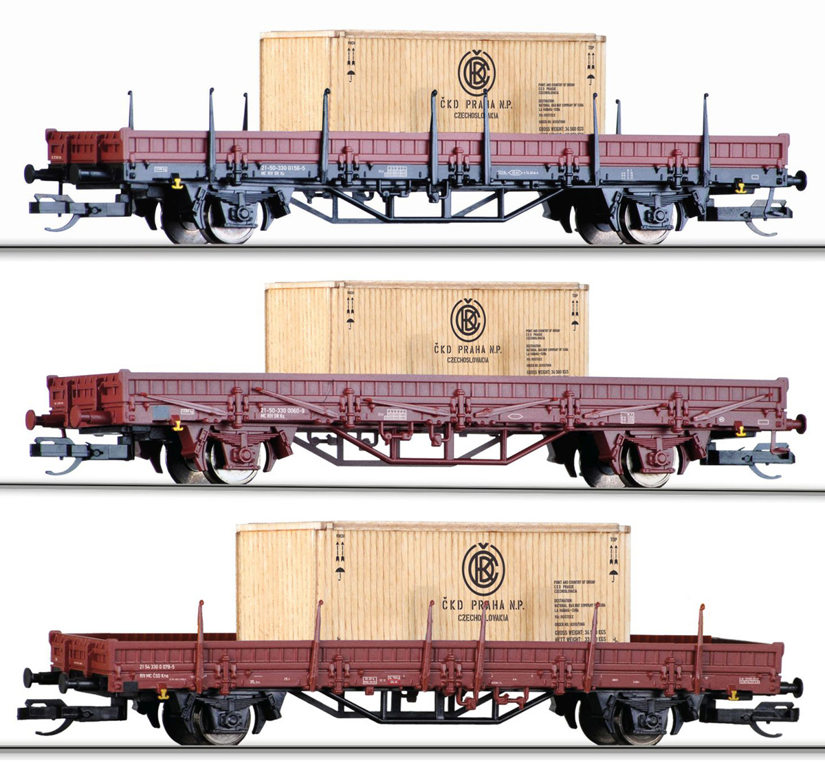 | set tří nízkostěnných vozů s nákladem beden „ČKD Praha“ |