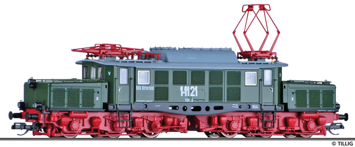 | elektrická lokomotiva zelená se světle šedou střechou, vlečková „BKK Bitterfeld“ |
