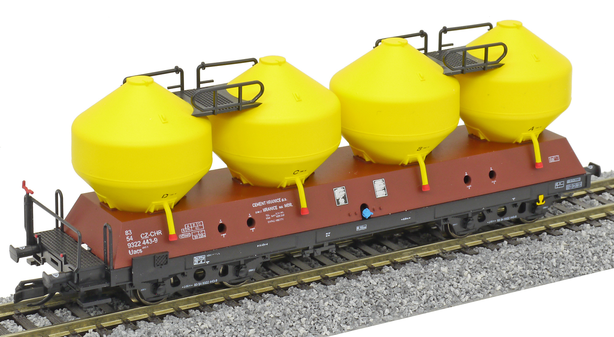 | nákladní samovýsypný vůz červenohnědý, nádoby žluté „Cement Hranice“ |