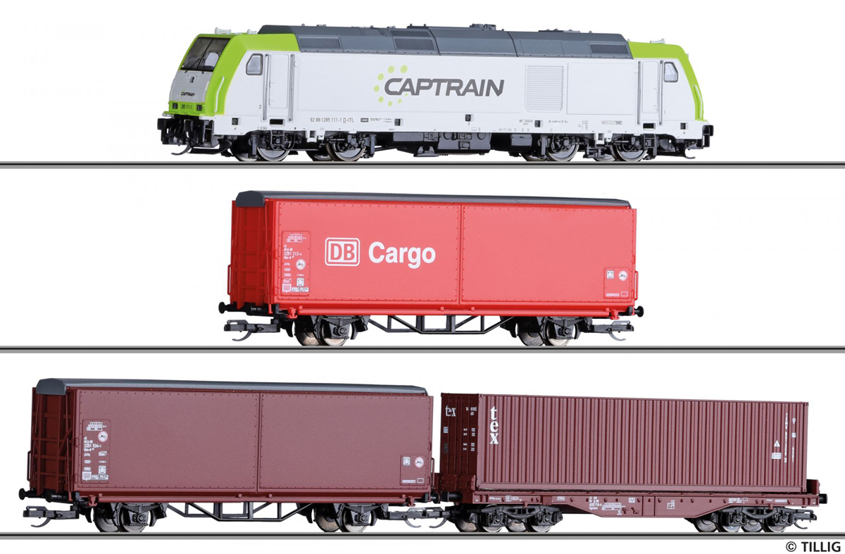 | set dieselové lokomotivy a tří nákladních vozů |
