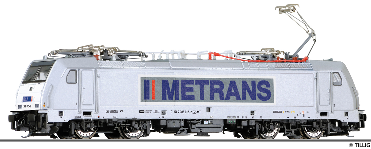 | elektrická lokomotiva bílá s logem „METRANS“ |