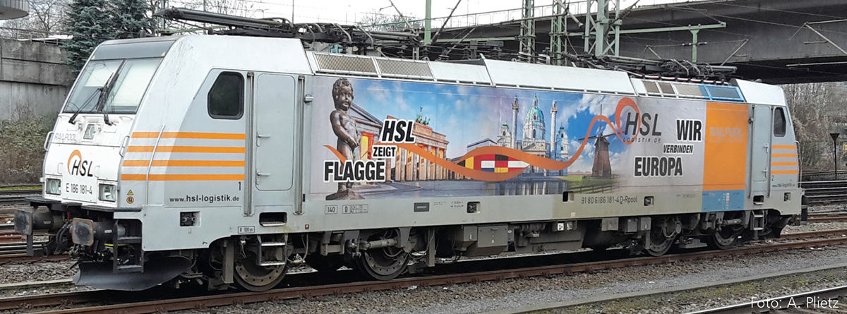 | elektrická lokomotiva s reklamním potiskem „HSL Logistik GmbH“ |
