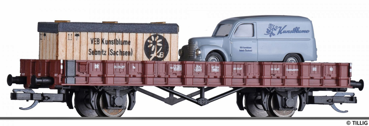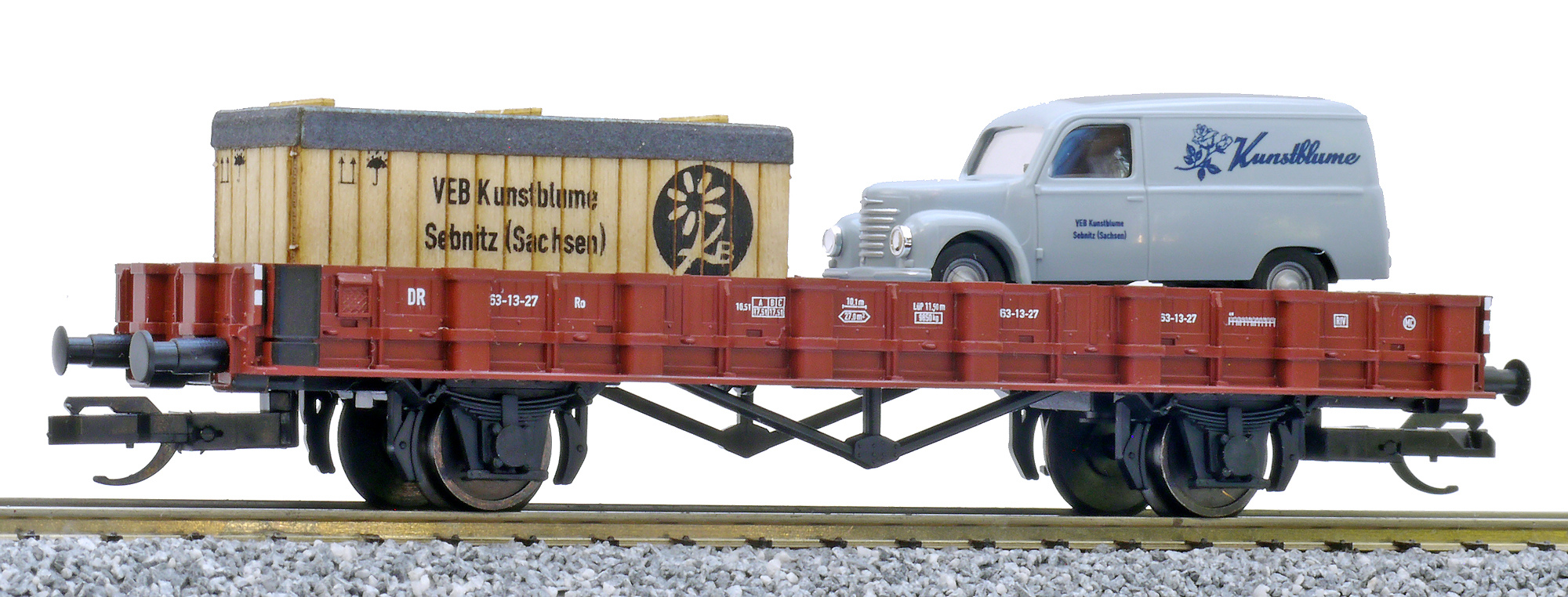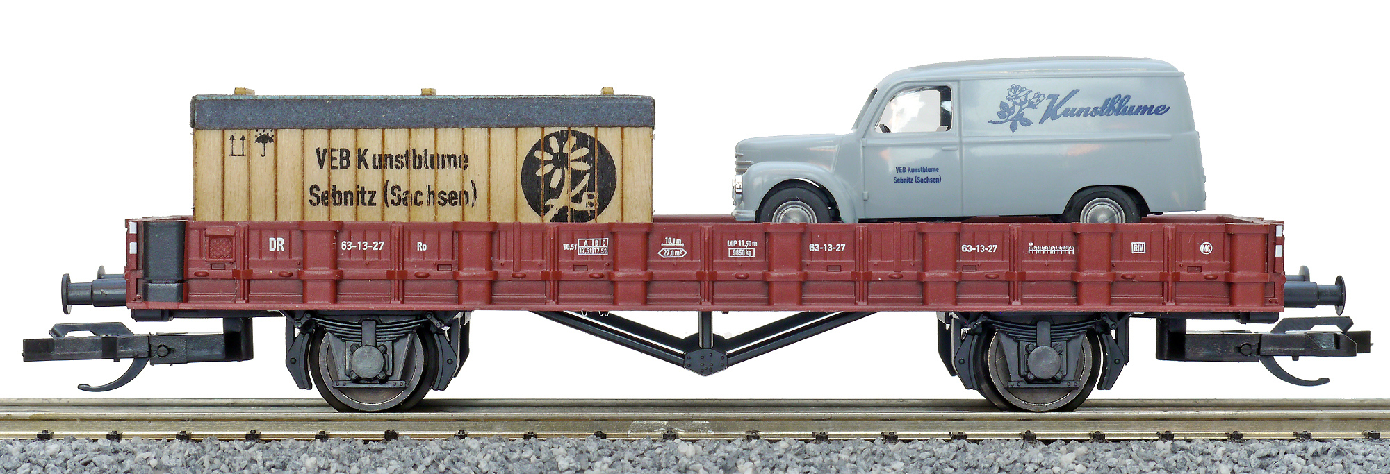 | nízkostěnný nákladní vůz ložený dodávkou Framo „Kunstblume“ a bedny |