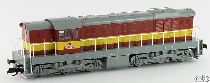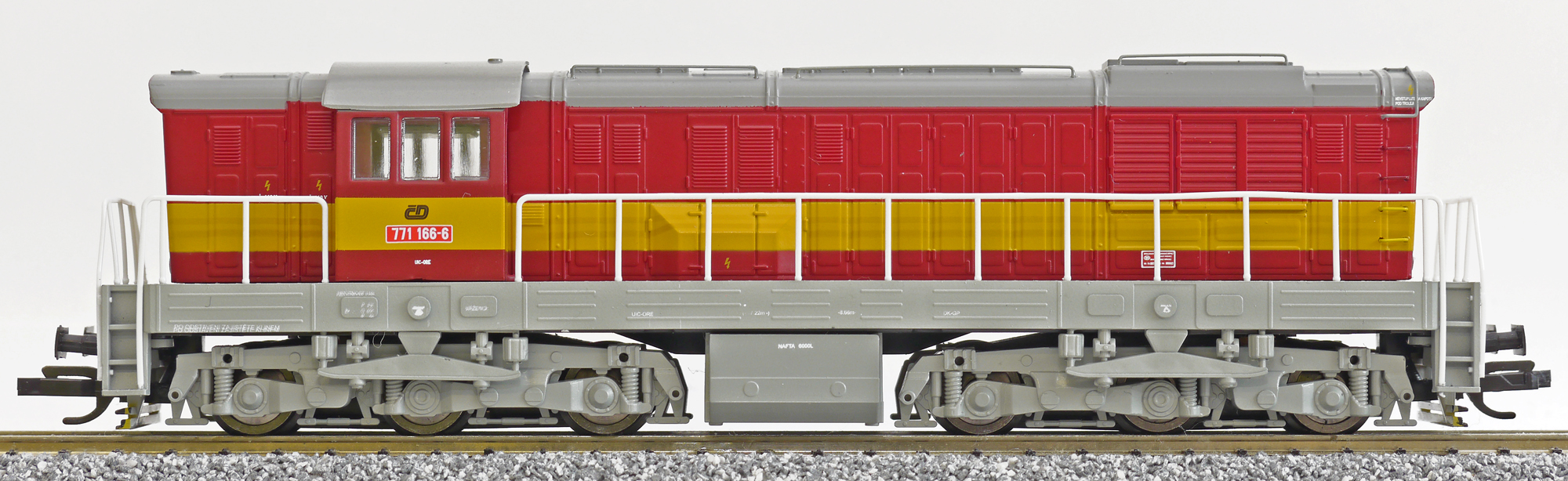 | dieselová lokomotiva červená s výstražným pruhem, šedá střecha, rám a pojezd |