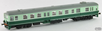 | motorový vůz zelený-tyrkysový s šedou střechou, výstražný pruh na čelech |