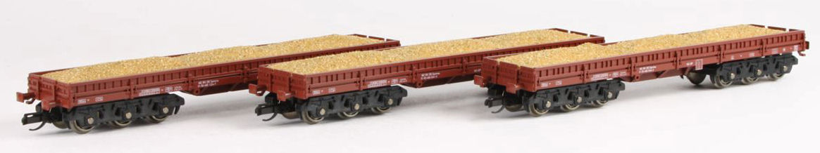 | set tří nízkostěnných vozů s nákladem písku |