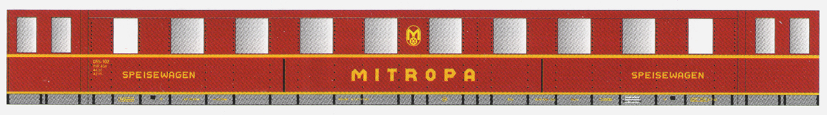 | jídelní vůz červený se stříbřitou střechou „MITROPA“ |