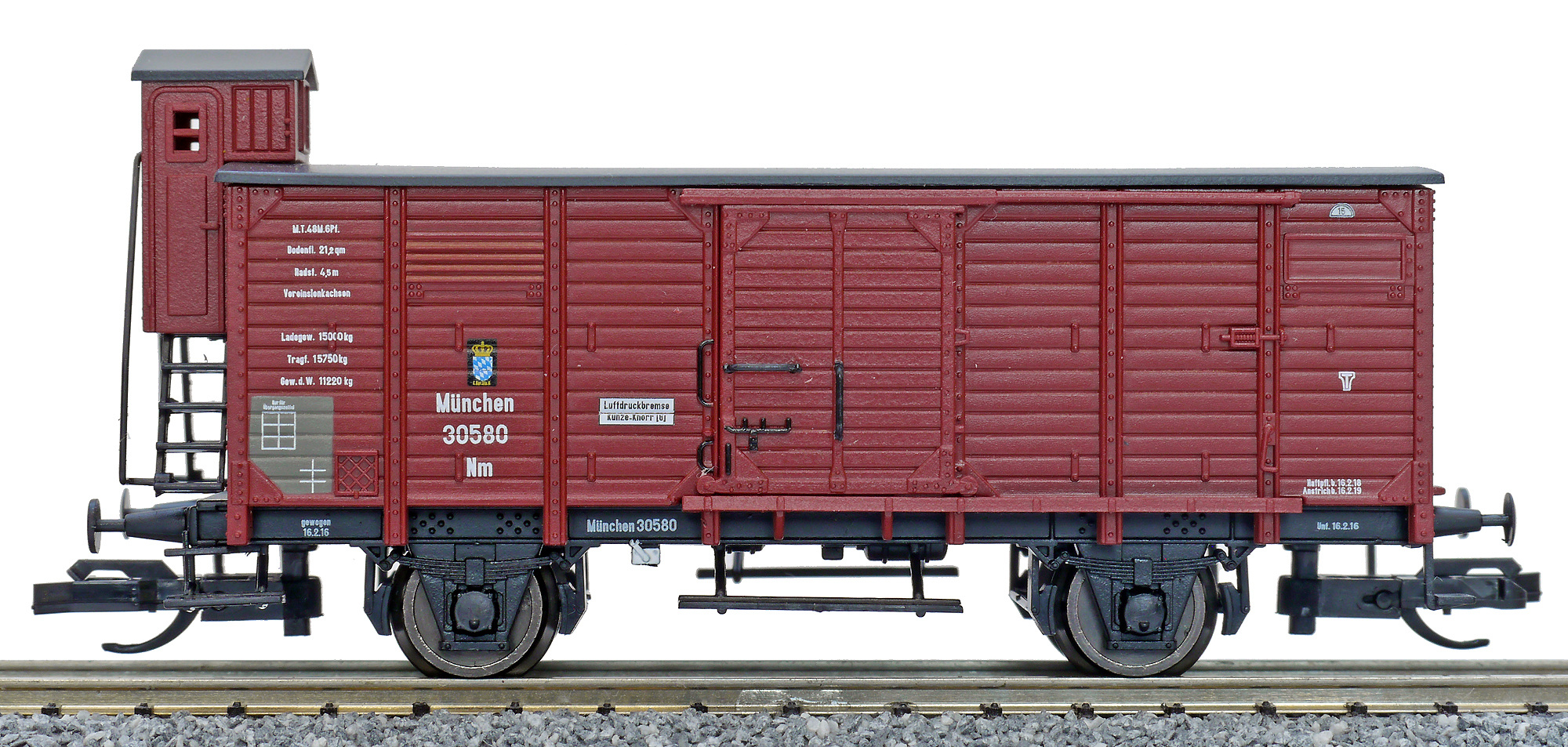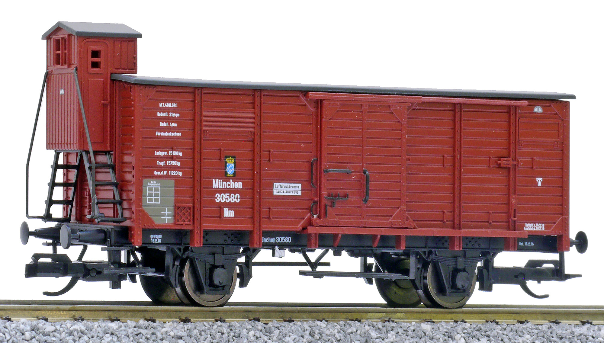 | krytý nákladní vůz červenohnědý s černou střechou a s brzdařskou budkou |