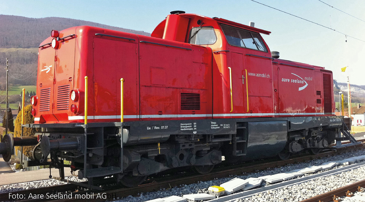 | dieselová lokomotiva červená, černý rám a pojezd „Aare Seeland mobil AG“ |