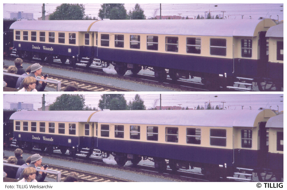 Popis   osobní vůz modrý-slonová kost s šedou střechou 2. tř. „Deutsche Weinstraße 1“