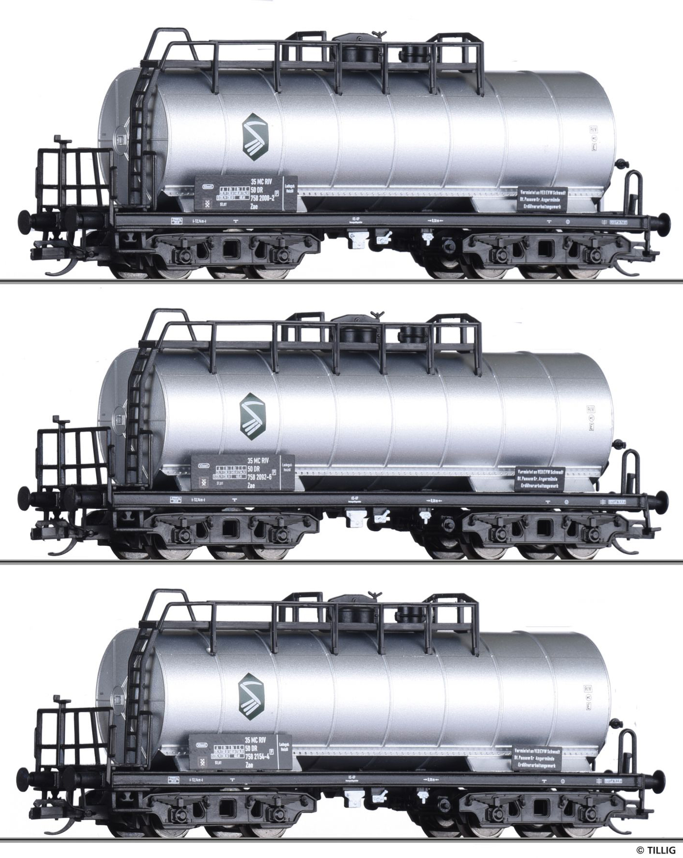 | set tří kotlových vozů s podélnou lávkou s logem s logem „VEB EVW Schwedt“ |