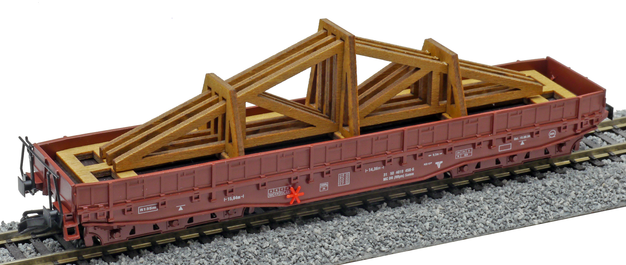 | nízkostěnný nákladní vůz červehonědý s nákladem krovů |