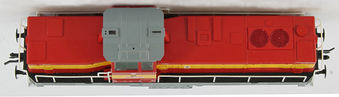 | dieselová lokomotiva červená s výstražným pruhem, šedá střecha, rám a pojezd |