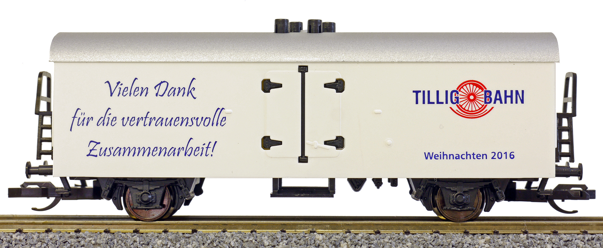 | chladící vůz bílý s šedou střechou a s reklamním potiskem „Weihnachten 2016“ |