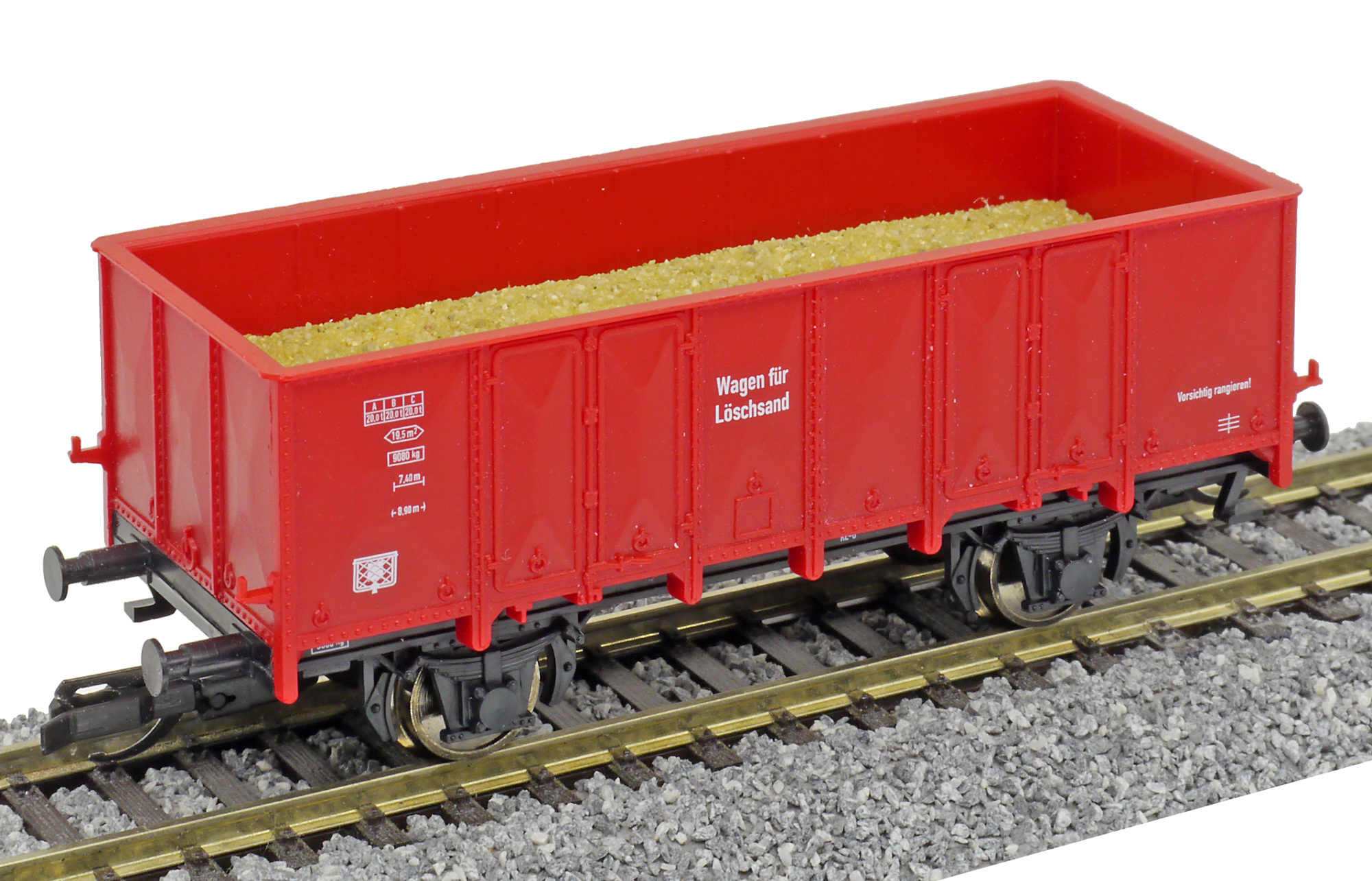 Popis   otevřený vůz červený s nákladem písku do požárního vlaku