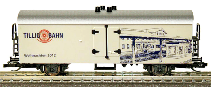 Popis   chladící vůz bílý s šedou střechou a s reklamním potiskem „Weihnachten 2012“