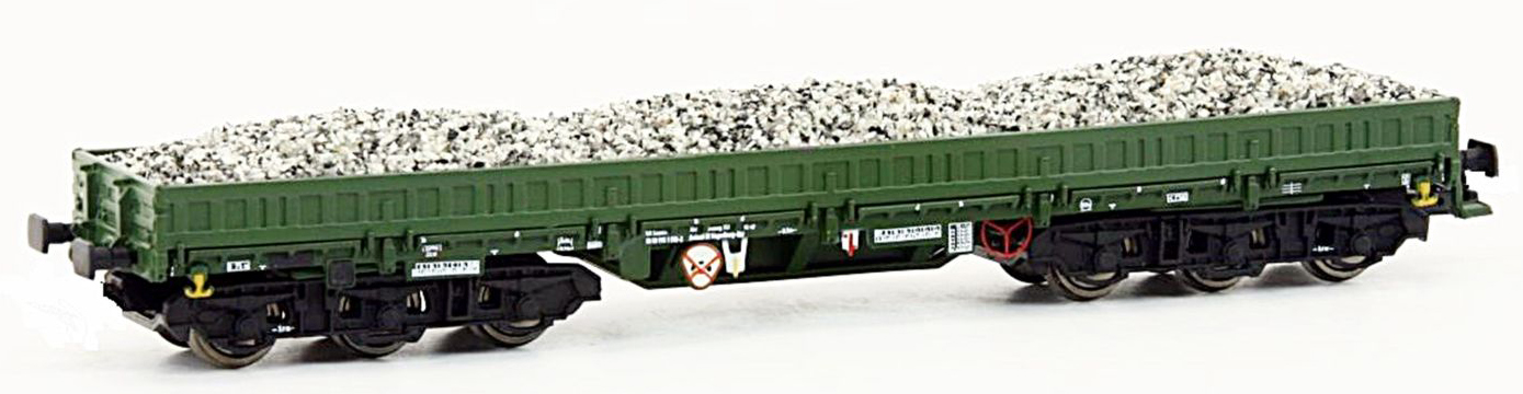 | nízkostěnný nákladní vůz zelený s nákladem štěrkem |