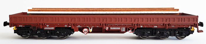 | nízkostěnný nákladní vůz červenohnědý s nákladem dlouhého zásobníku pražců |