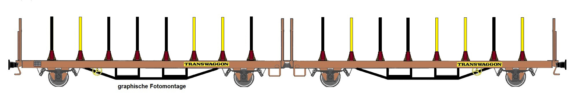 | dvojdílný plošinový nákladní vůz červenohnědý s nebarvenými klanicemi „Transwaggon“ |