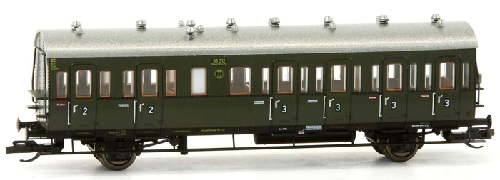| osobní oddílový vůz zelený se stříbřitou střechou 2./3. tř. |