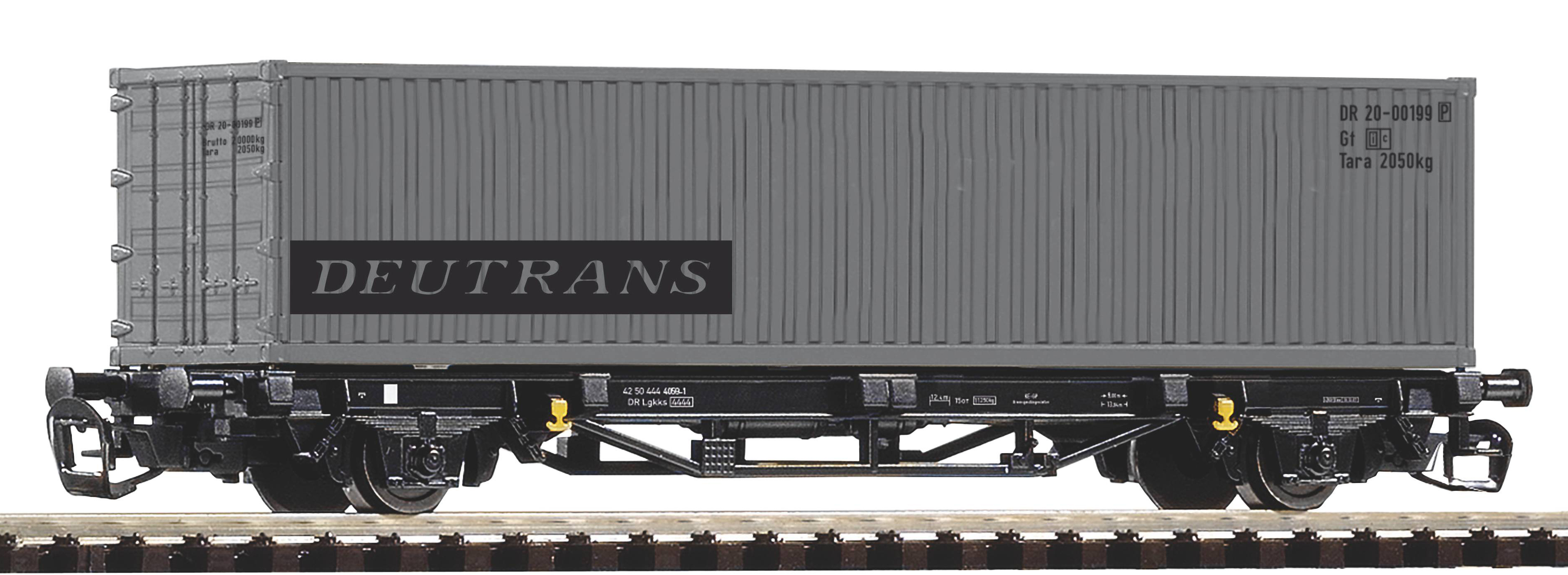 | plošinový vůz červený s nákladem 1x40' kontejneru „Deutrans“ |