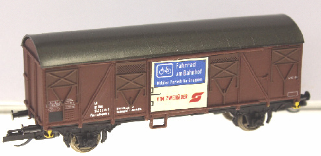 | krytý nákladní vůz červenohnědý na přepravu kol „Fahrrad am Bahnhof“ |