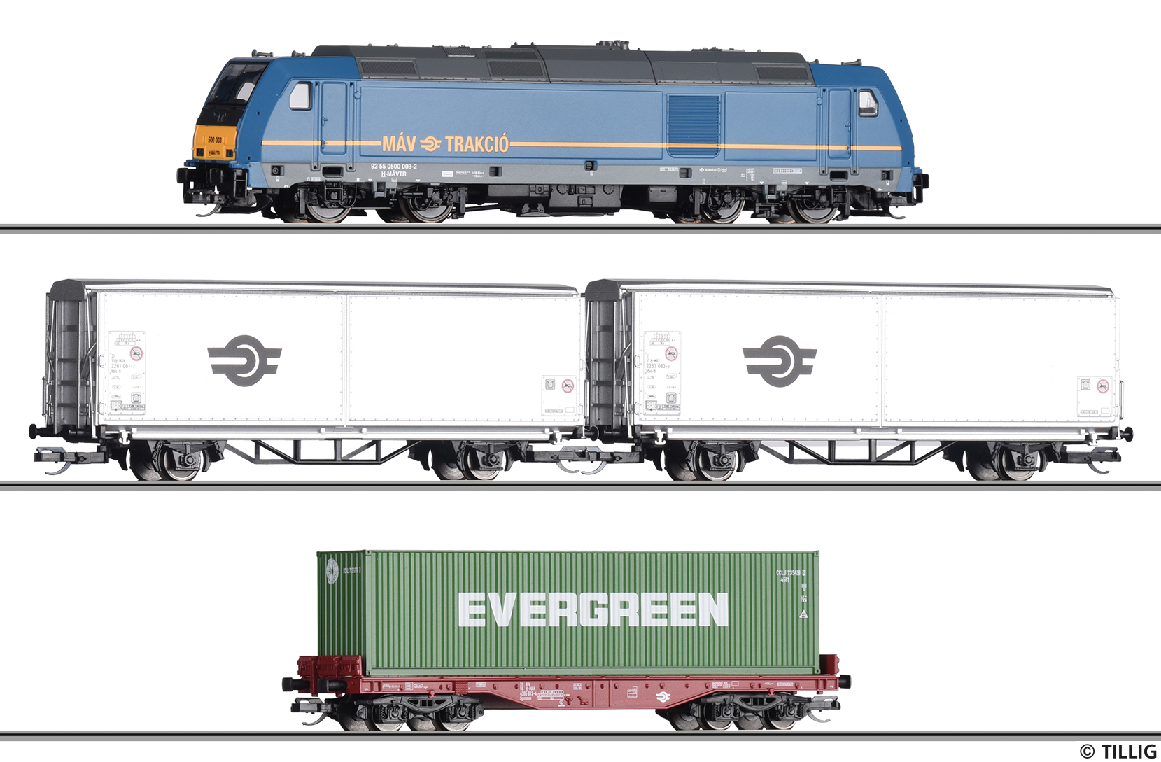 | set dieselové lokomotivy „TRAXX“ a tří nákladních vozů |