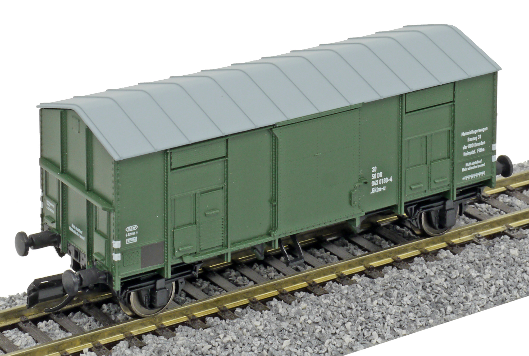 | krytý nákladní vůz zelený s šedou střechou do pracovního vlaku |