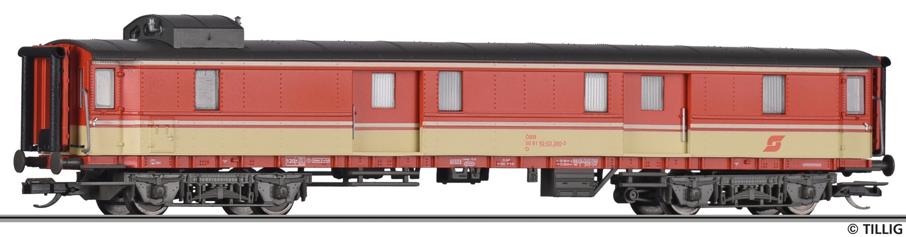 | zavazadlový vůz červený s krémovým pruhem, šedá střecha |