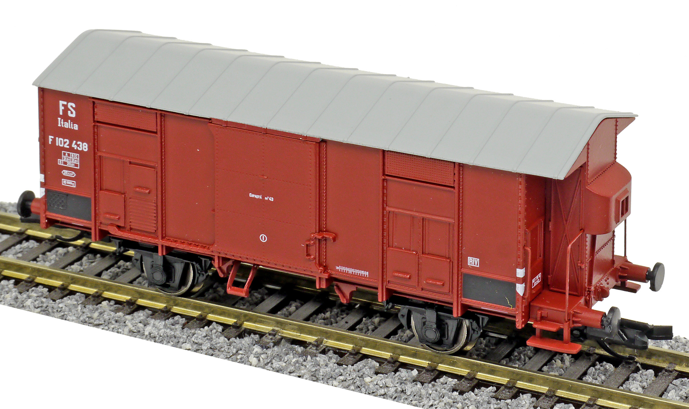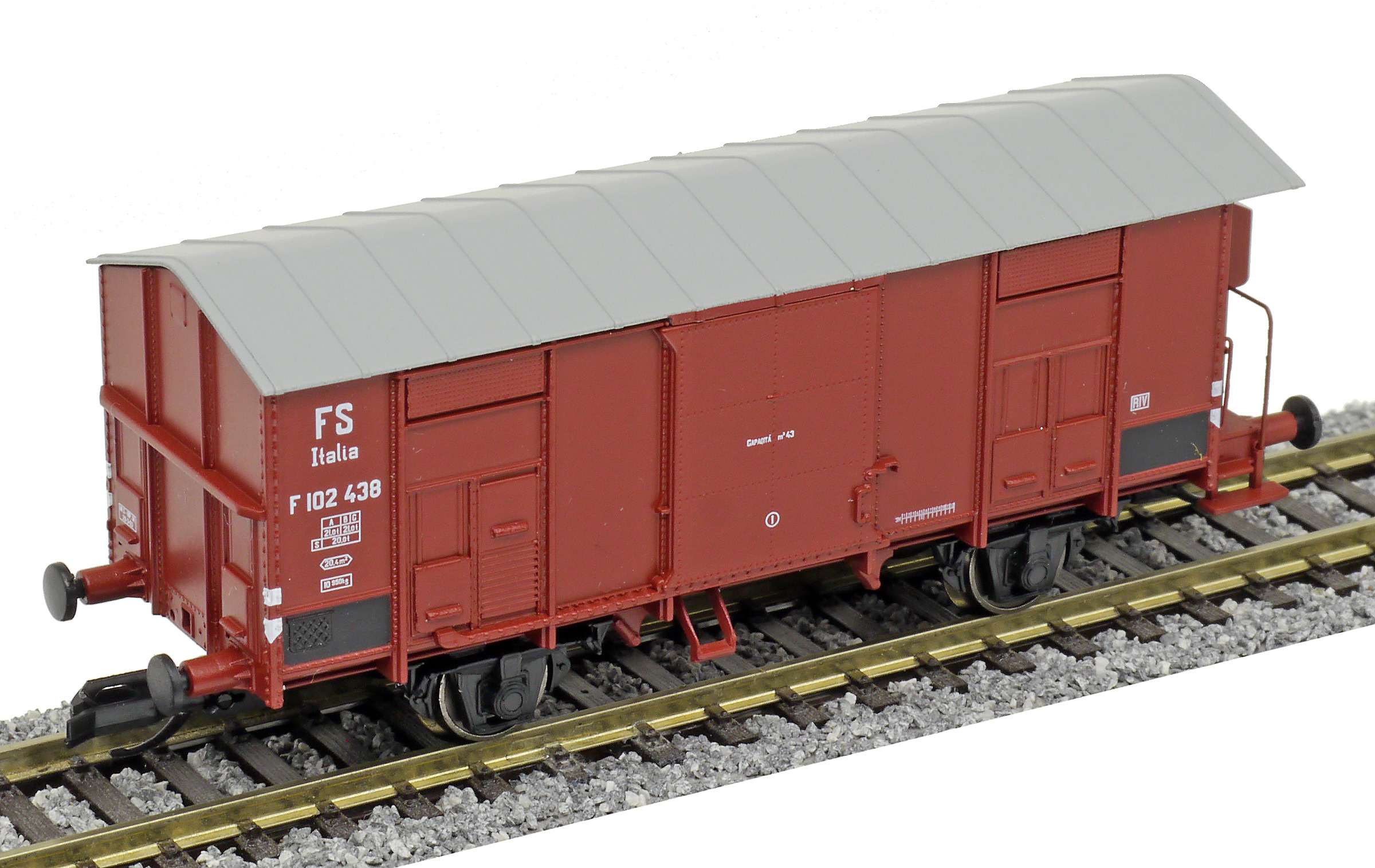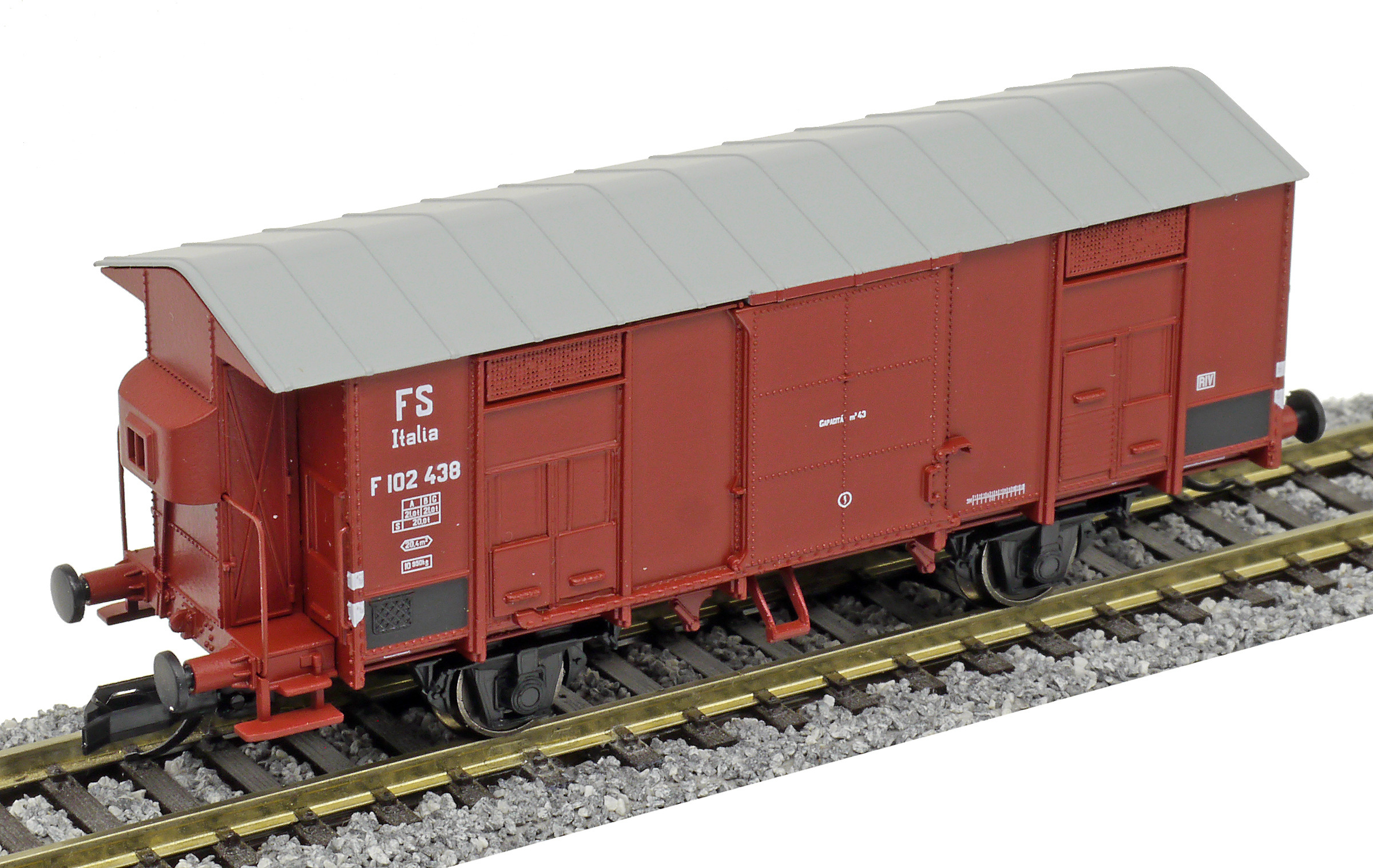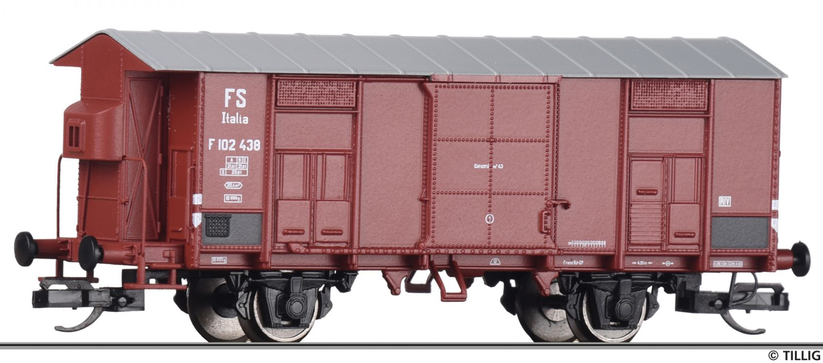 | krytý nákladní vůz červenohnědý s šedou střechou a s brzdařskou budkou |