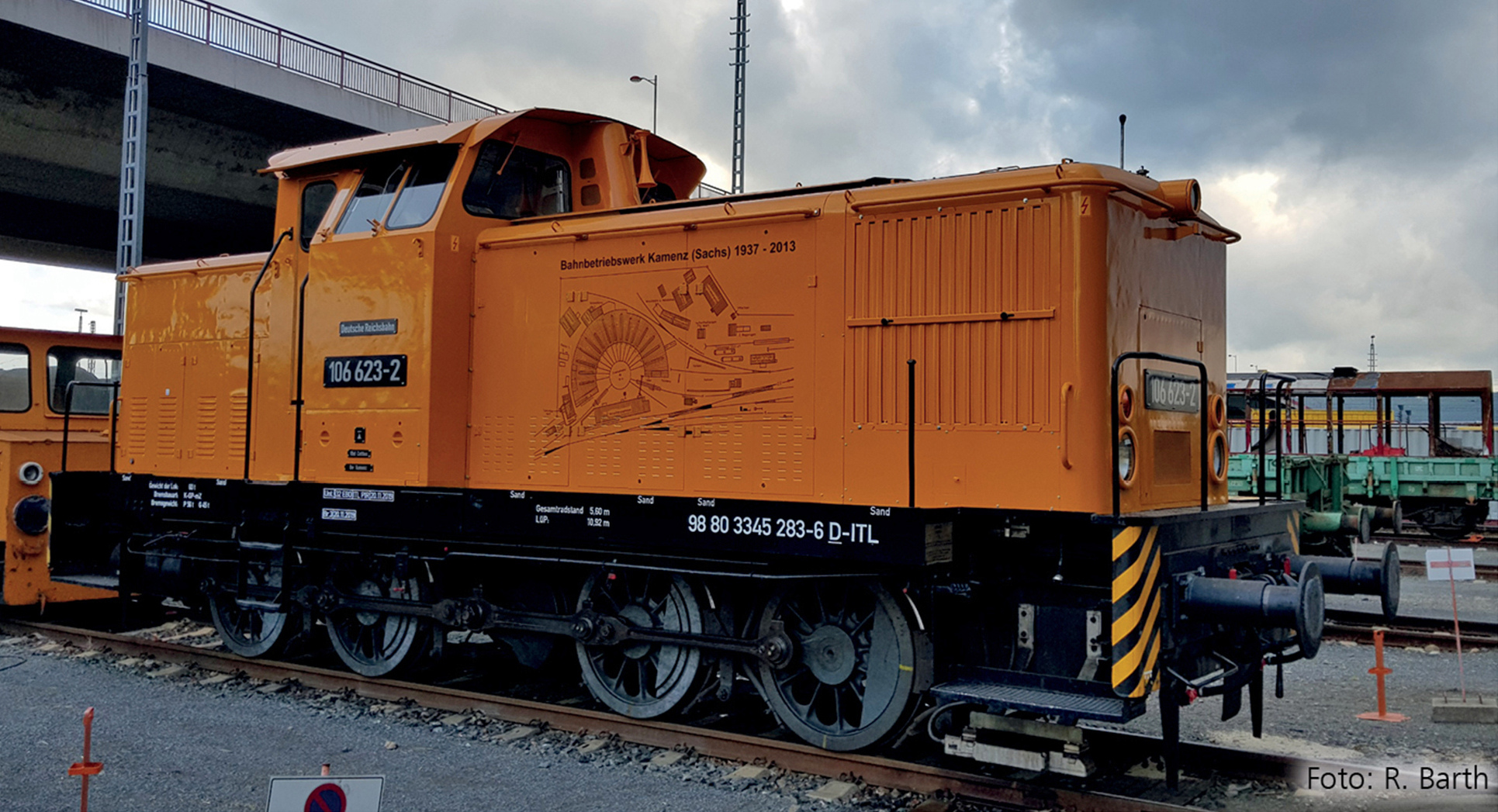 | dieselová lokomotiva oranžová, černý rám s potiskem motivu „Bahnbetriebswerk Kamenz“ |