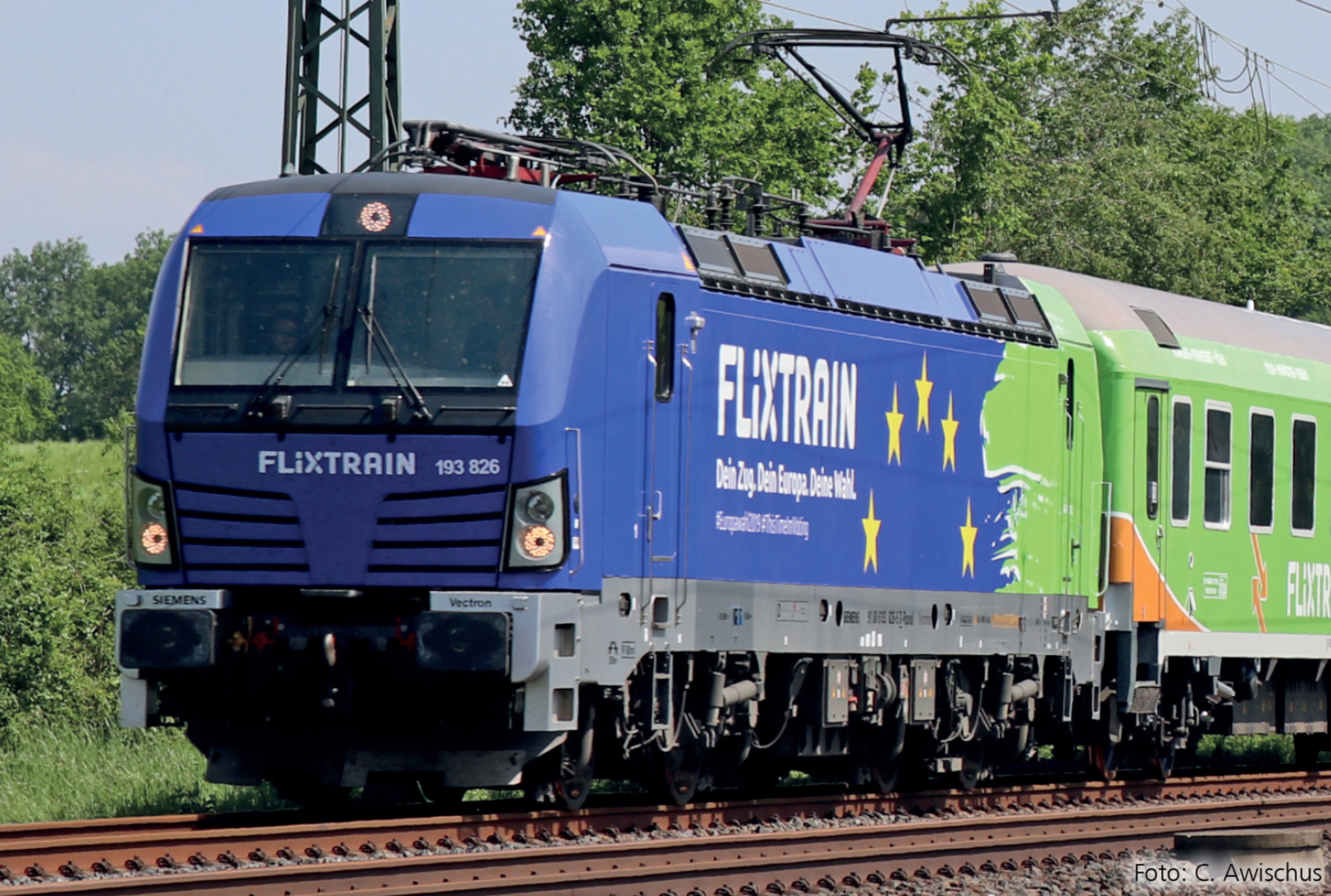 | elektrická lokomotiva modrá-zelená s potiskem „FLIXTRAIN“ |