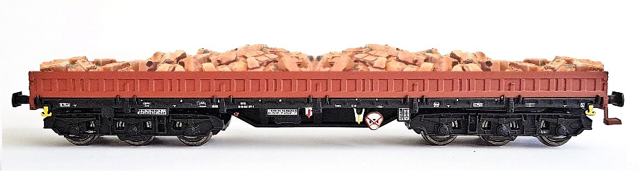 | nízkostěnný nákladní vůz červenohnědý s nákladem stavební suti |