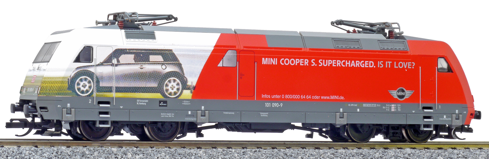 | elektrická lokomotiva s reklamním potiskem „Mini BMW“ |